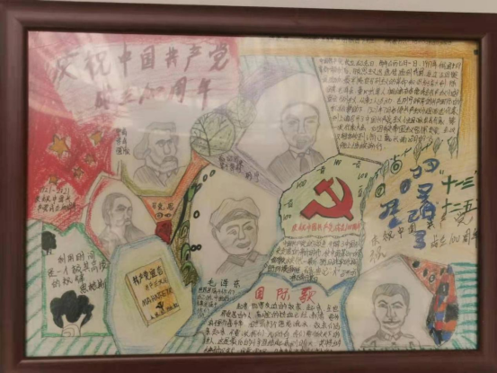 今天,让我们一起来欣赏绘画类作品,展览内容分别为:党史开篇总述、近代中国简述、五四员工爱国运动、红船精神、南昌起义、长征精神、党的七大、抗日战争胜利、新中国成立、抗美援朝战争、两弹一星、 改革开放、中国梦、习近平新时代中国特色社会主义思想、脱贫攻坚等,总共24个专题。作品由员工手工绘制,并镶有相框,陈列在致知楼1楼至5楼的走廊上,时间上由远及近,回顾中国共产党一百年的风雨历程。让师生沉浸在历史时光的长廊中不忘初心,让师生体会到我党艰苦创业的岁月里牢记使命,继而砥砺前行。