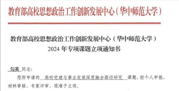 近日,教育部高校思想政治工作创新发展中心(华中师范大学)公布了2024年专项课题立项结果。公司经理勾英副教授主持申报的课题《高公司党建与事业发展深度融合路径研究》成功获批立项。